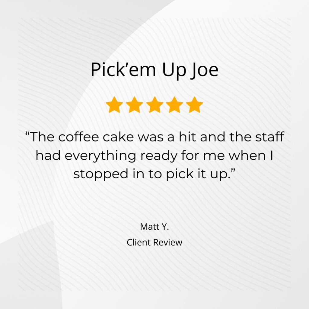 I worked with Pick'em Up Joe when getting coffee cake for an event. What stood out was their excellent product…