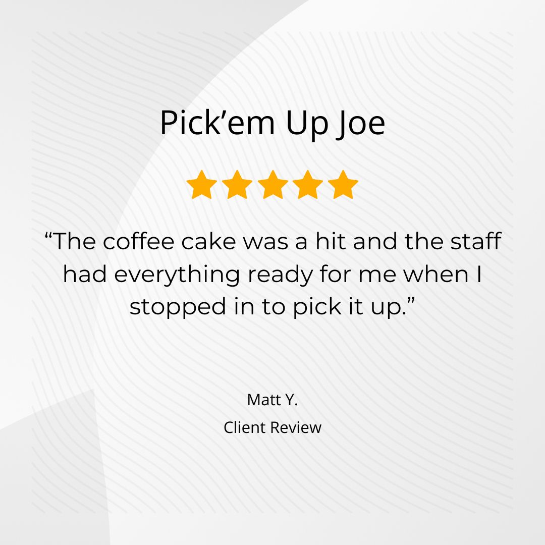 I worked with Pick'em Up Joe when getting coffee cake for an event. What stood out was their excellent product and efficient staff, which is why I'd recommend them to anyone who needs high quality snacks and service.
